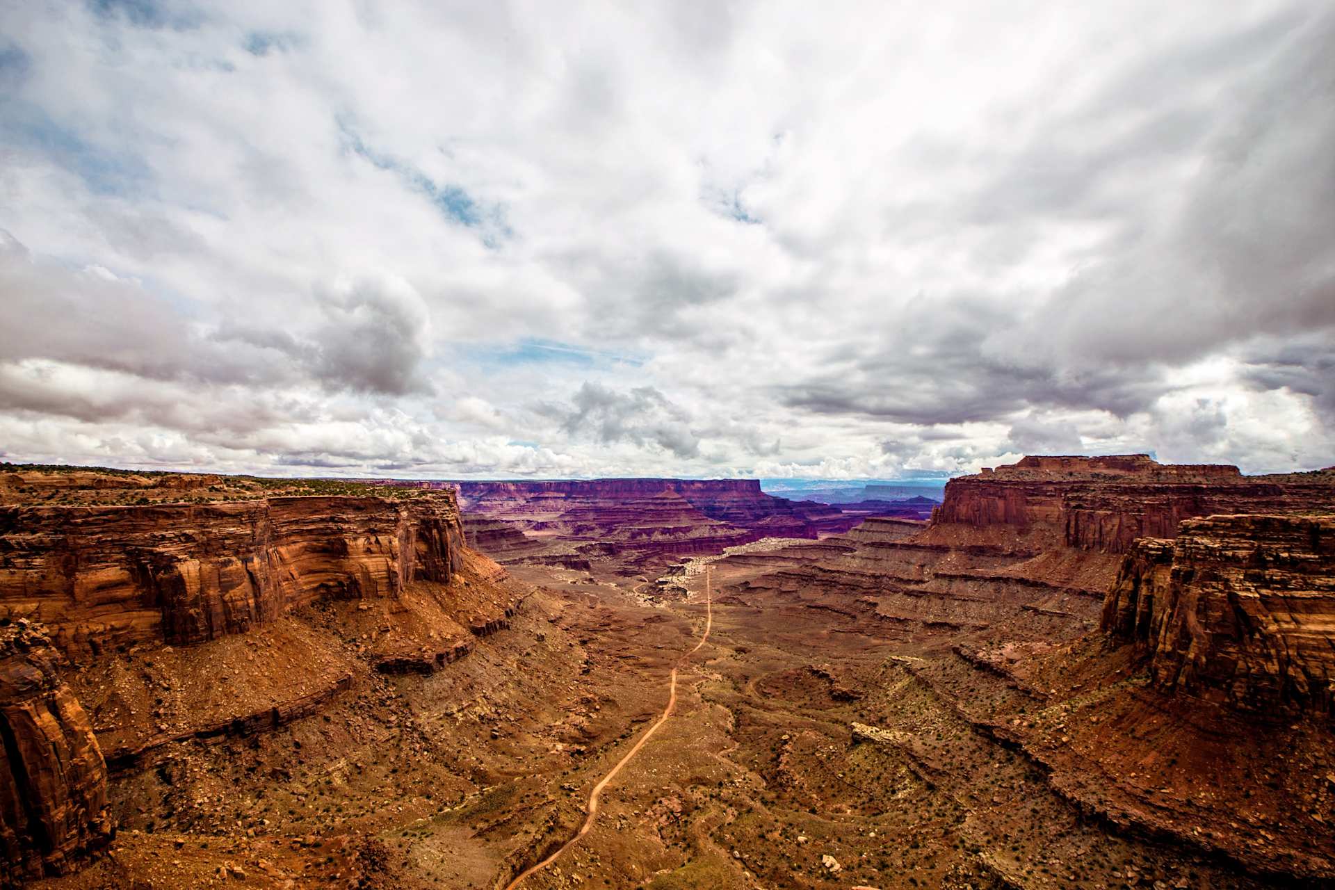 While the overlook provides another expansive view of the stretches of Shafer Canyon, the focal point is Shafer Trail road. The dirt track winds its way through the valley and turns into narrow switchbacks for 4x4 vehicles to climb the steep canyon walls. It’s quite a neat sight to see an ant-sized vehicle coming into view as it cautiously makes its way up Shafer Road.