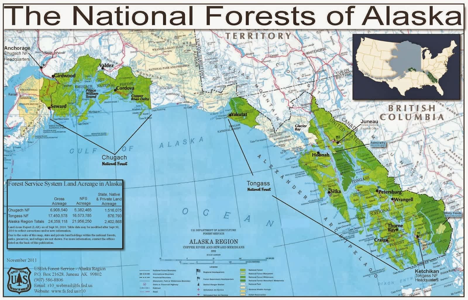 - The 2 biggest national forests are in Alaska: The Tongass and the Chugach. National Forests are public lands owned by the American people through the federal government. The lands managed by the U.S. Forest Service, National Park Service, and other land agencies. They are set aside to sustain the health, diversity, and productivity of the Nation's forests and grasslands to meet the needs of present and future generations. Learn more about Tongass National Forest and Chugach National Forest!