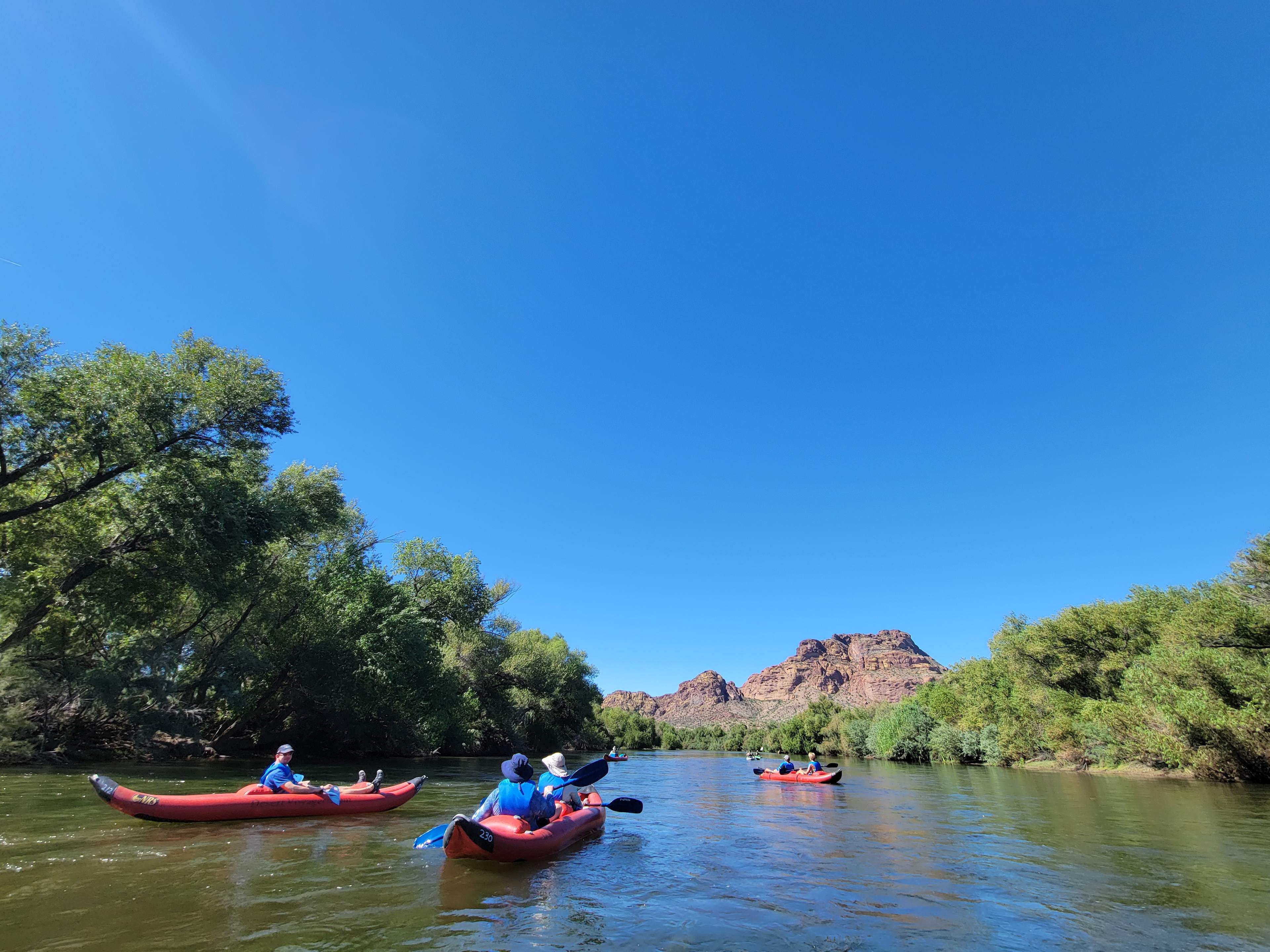 Meet in Scottsdale and shuttle to the nearby Salt River for a float trip by inflatable kayaks. This relaxing morning paddle is the perfect way to cool off on a warm day in Arizona’s desert. You’ll glide along lush green riverbanks and towering red cliffs, keeping alert for sightings of wild horses and bald eagles.